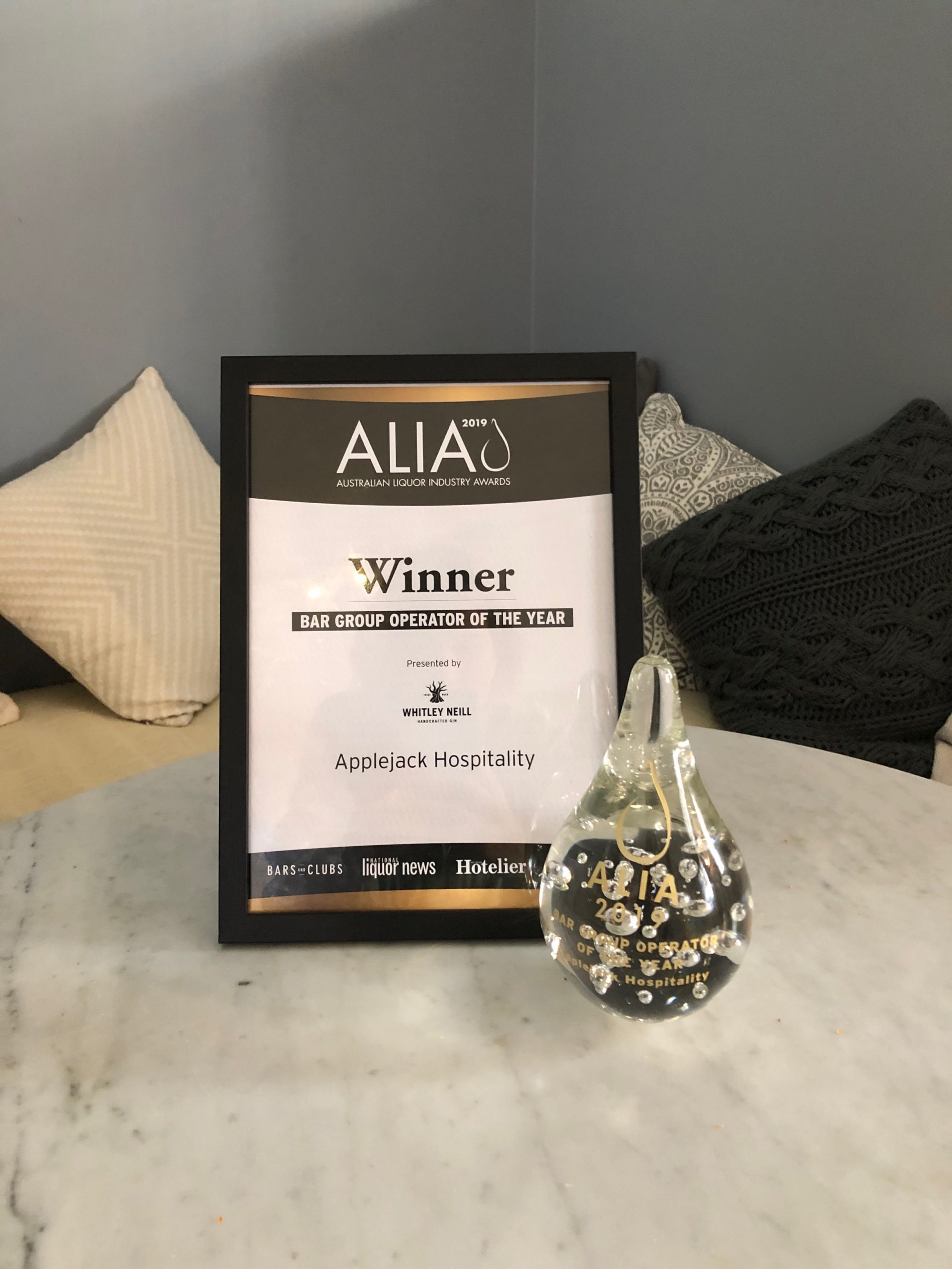 The Australian Liquor Industry Awards ceremony (the ALIA’s) were held last night in Sydney and we’re very proud to announce that Applejack Hospitality took out the prestigious award for Bar Group Operator of the Year 2019, an award previously won by the likes of the Swillhouse Group and Speakeasy Group.
